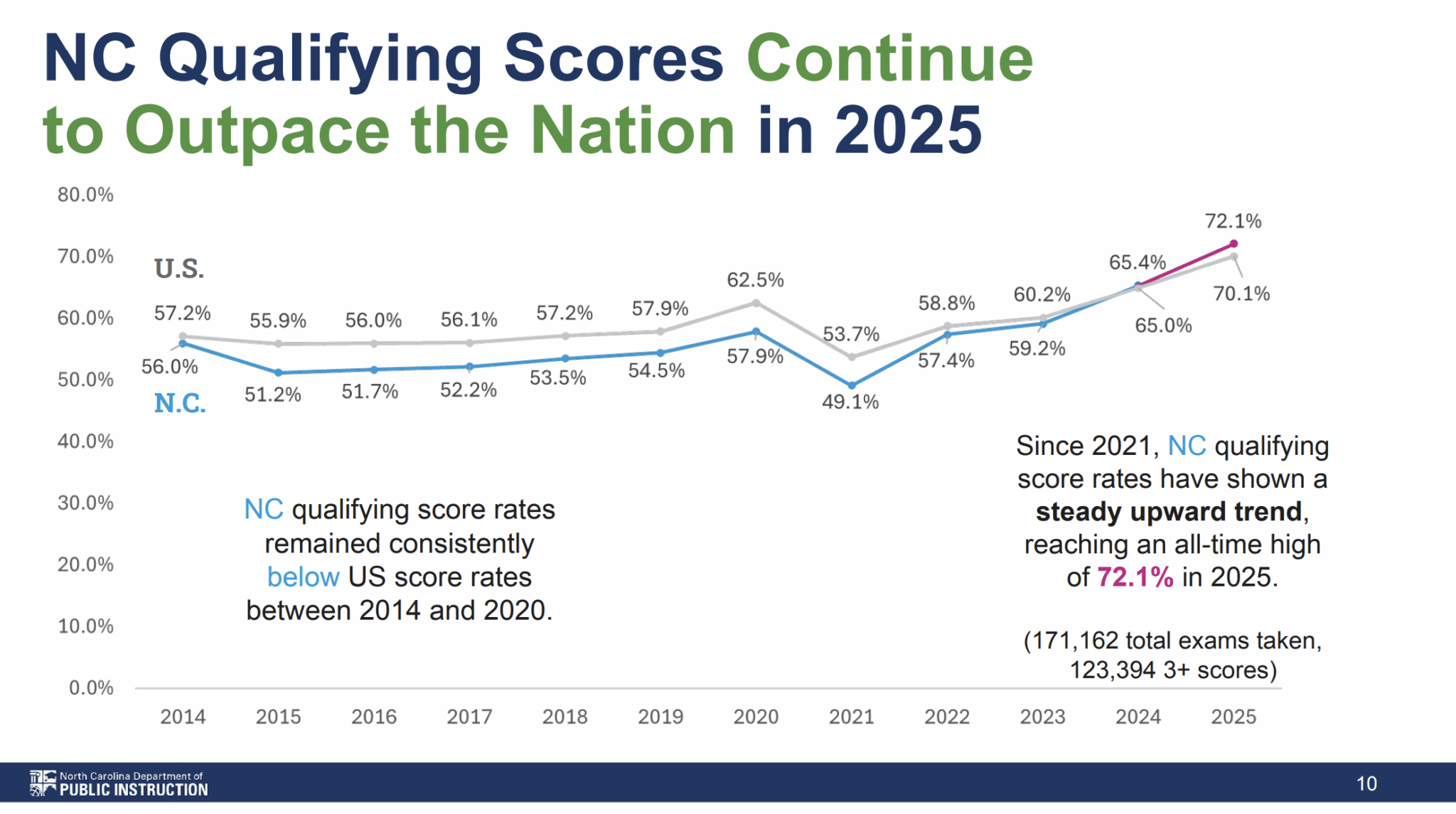 Students also performed better on these exams than ever before, according to the Department of Public Instruction (DPI). The number of exams with qualifying scores of 3 or higher increased by 21% to reach a success rate of 72.1%. That means North Carolina students surpassed the national success rate of 70.1%.