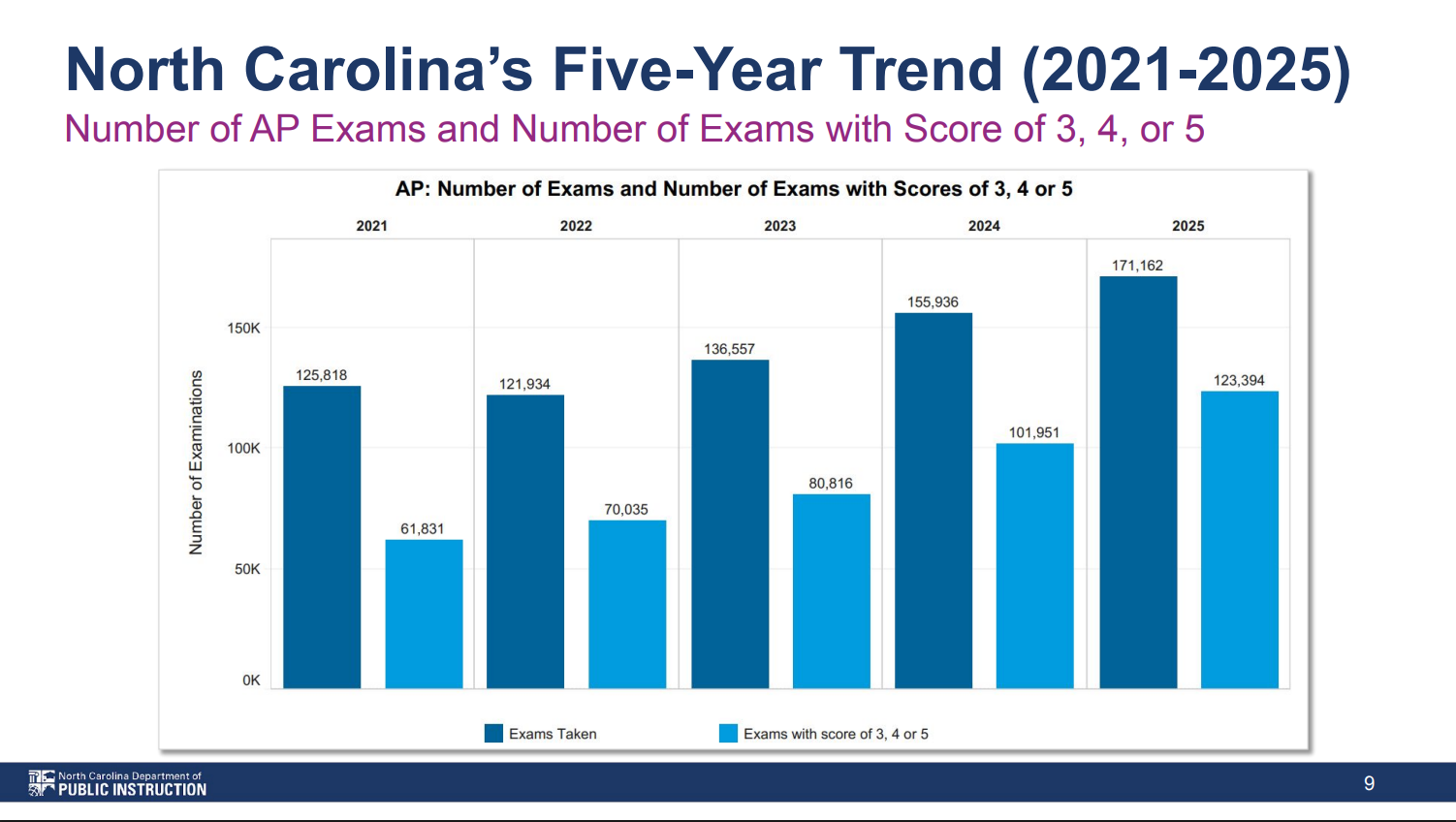 North Carolina students’ participation and success in Advanced Placement (AP) exams reached their highest level during the 2024-25 school year, according to data presented at the State Board of Education’s biannual planning and work session on November 5.